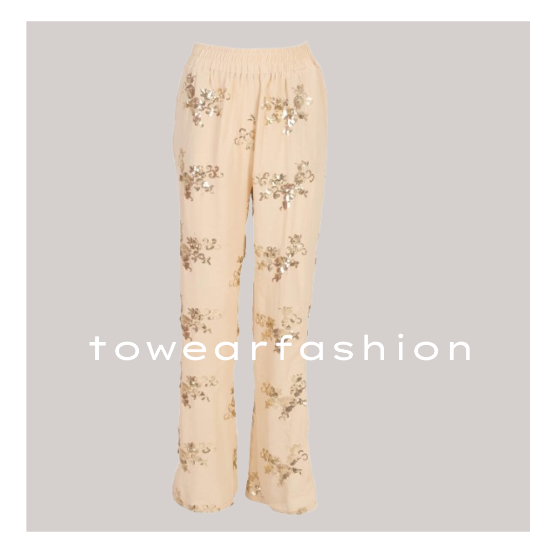ProductomschrijvingBroek met elastieken band en rechte pijp. De broek heeft 2 steekzakjes en is voorzien van gouden pailletten.