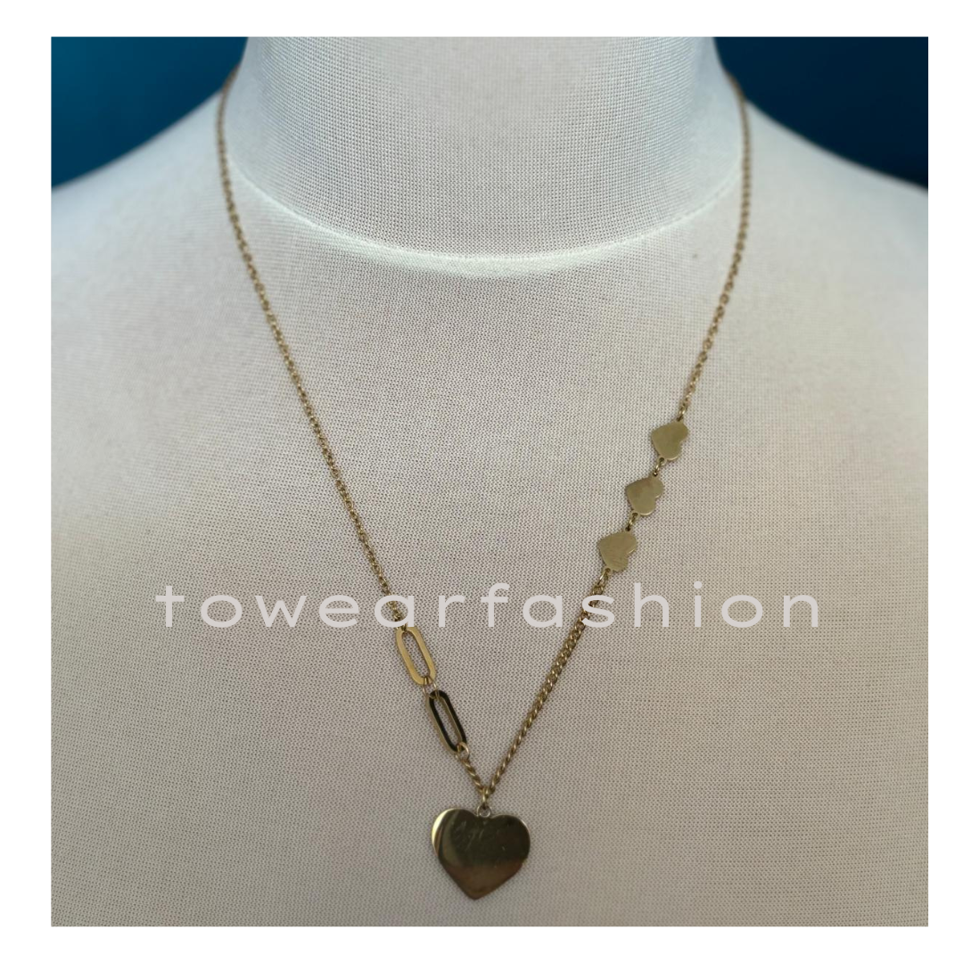 Goudkleurige ketting met 3 grotere schakels, 3 kleine hartjes en een groot hart als hanger. Totale lengte 44 cm met een verlengstuk van 5 cm.