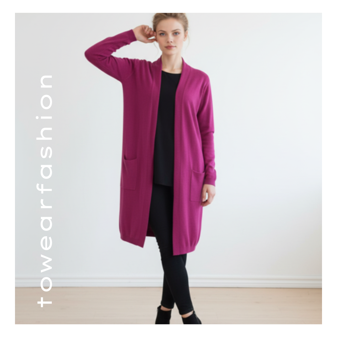 Mooi vest met sjaalkraag van dun breisel met een lengte tot boven de knie. Het vest heeft 2 zakken aan de voorkant.